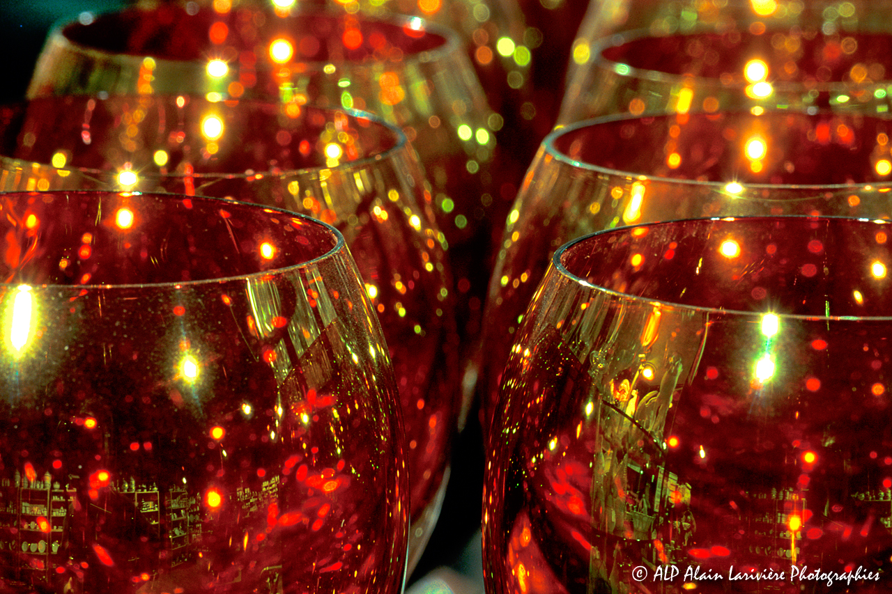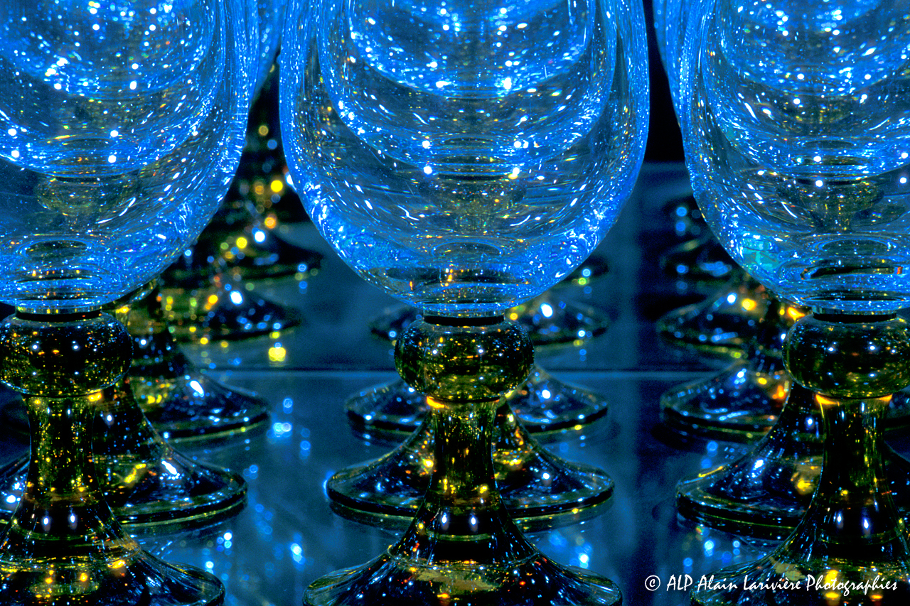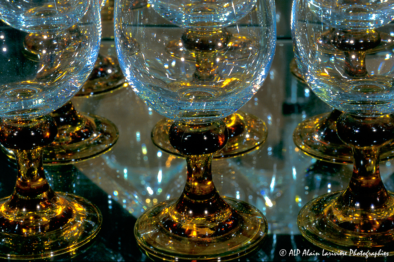 C’est en visitant le magasin de porcelaine et des arts de la table des établissement Marquet que j’ai remarqué tous les reflets sur les verres de différentes formes et couleurs présentés sur les étagères de verre.